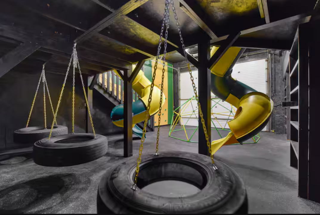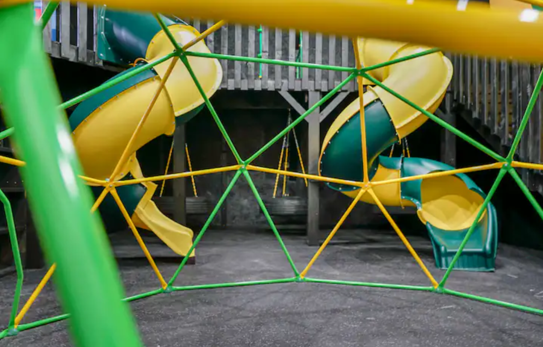 ★ The indoor commercial double-level park/playground (in the party shed) is heated and cooled, and has 2 tube slides, a hexagon climbing dome, 3 tire swings, a rock climb wall, and monkey bars, all on rubber flooring and flows directly into the indoor pool room on the second level and the party shed amenities on the first level.