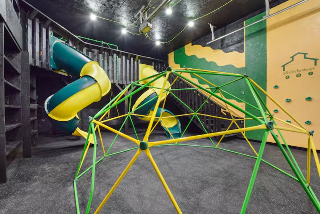 Big Sky Barnhouse…where historic meets extraordinary. This iconic barn sleeps 16+ in 6 BRs, 4 floors, 7000 sqft. Equipped w/ a 9-Hole Indoor Mini-Golf Course + 2 Pools! Outdoor Pool + Indoor Pool w/ Sauna + Shower. Dual-Level Indoor Park/Playground w/ Slides, Hexagon Dome, Rock Climb, Tire Swings + more. Movie Theater w/ Balcony, Home Gym, Arcade, Billiards, PingPong, SkeeBall + Bball Bunk Room. Slide down from the deck to the Boulder Firepit + enjoy the breathtaking views of the Driftless Hills