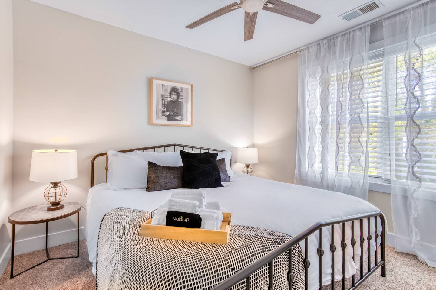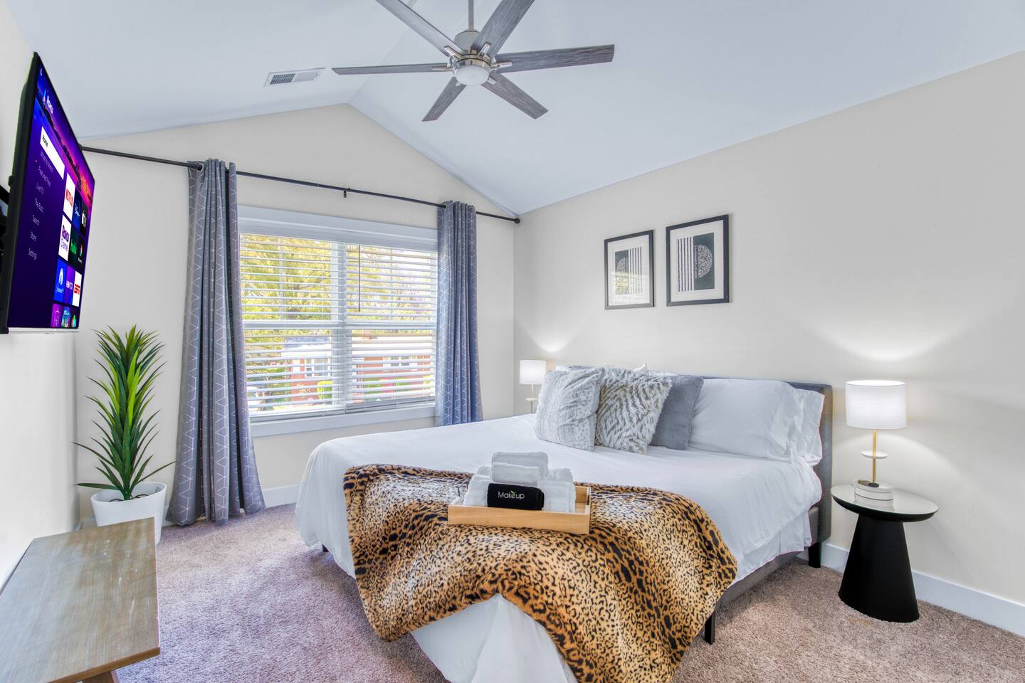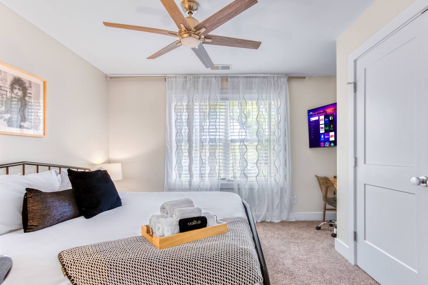 Three luxurious, uniquely curated bedrooms all with bedding and smart TVs (3 king beds, 1 queen air mattress).