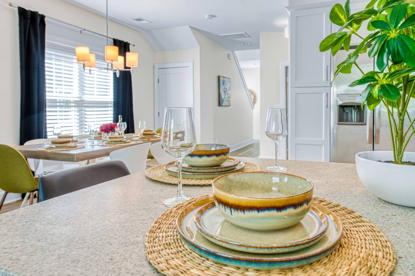 The beautiful dining table comfortably seats 6 with additional seating for 2 at the island.