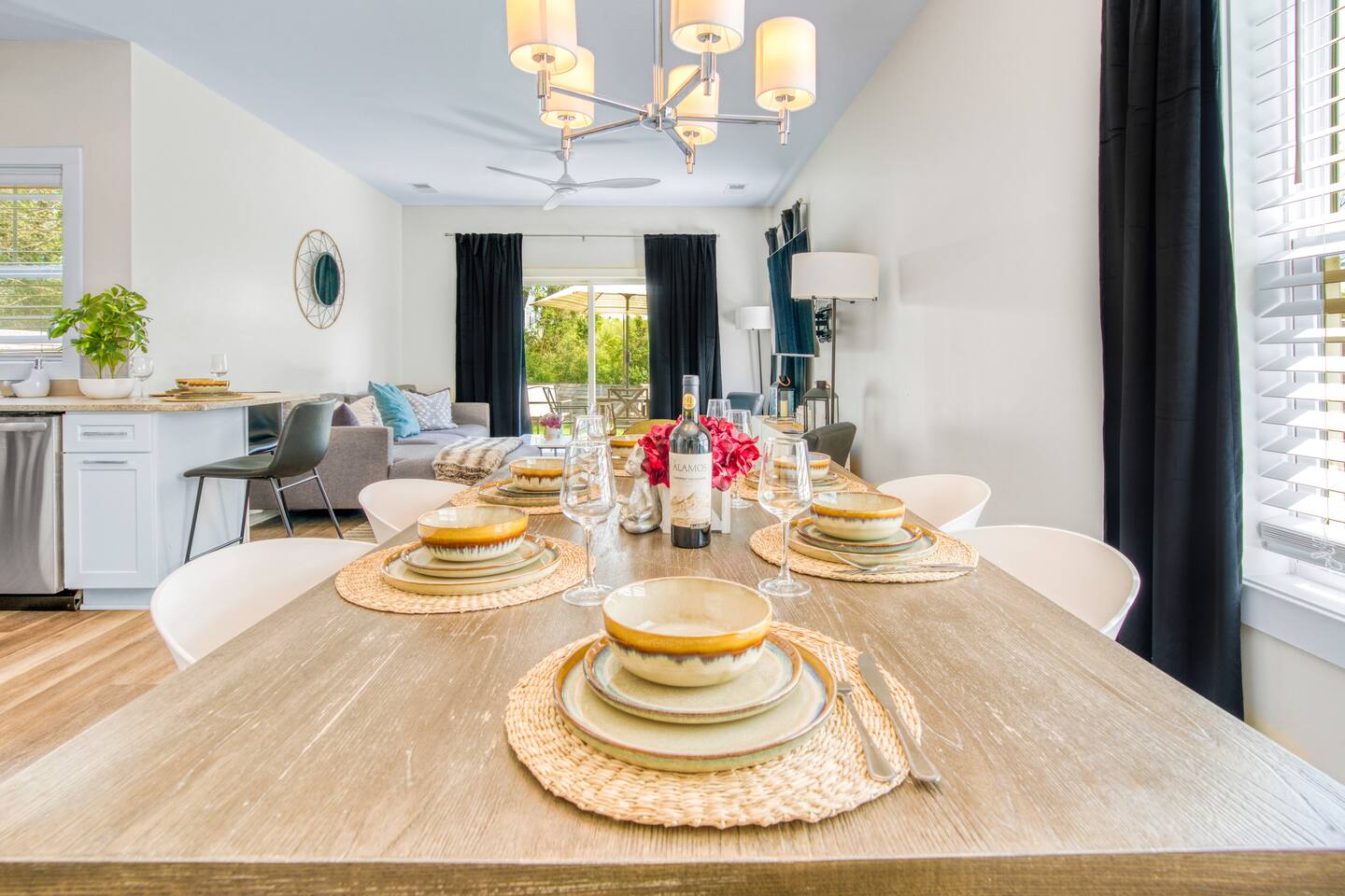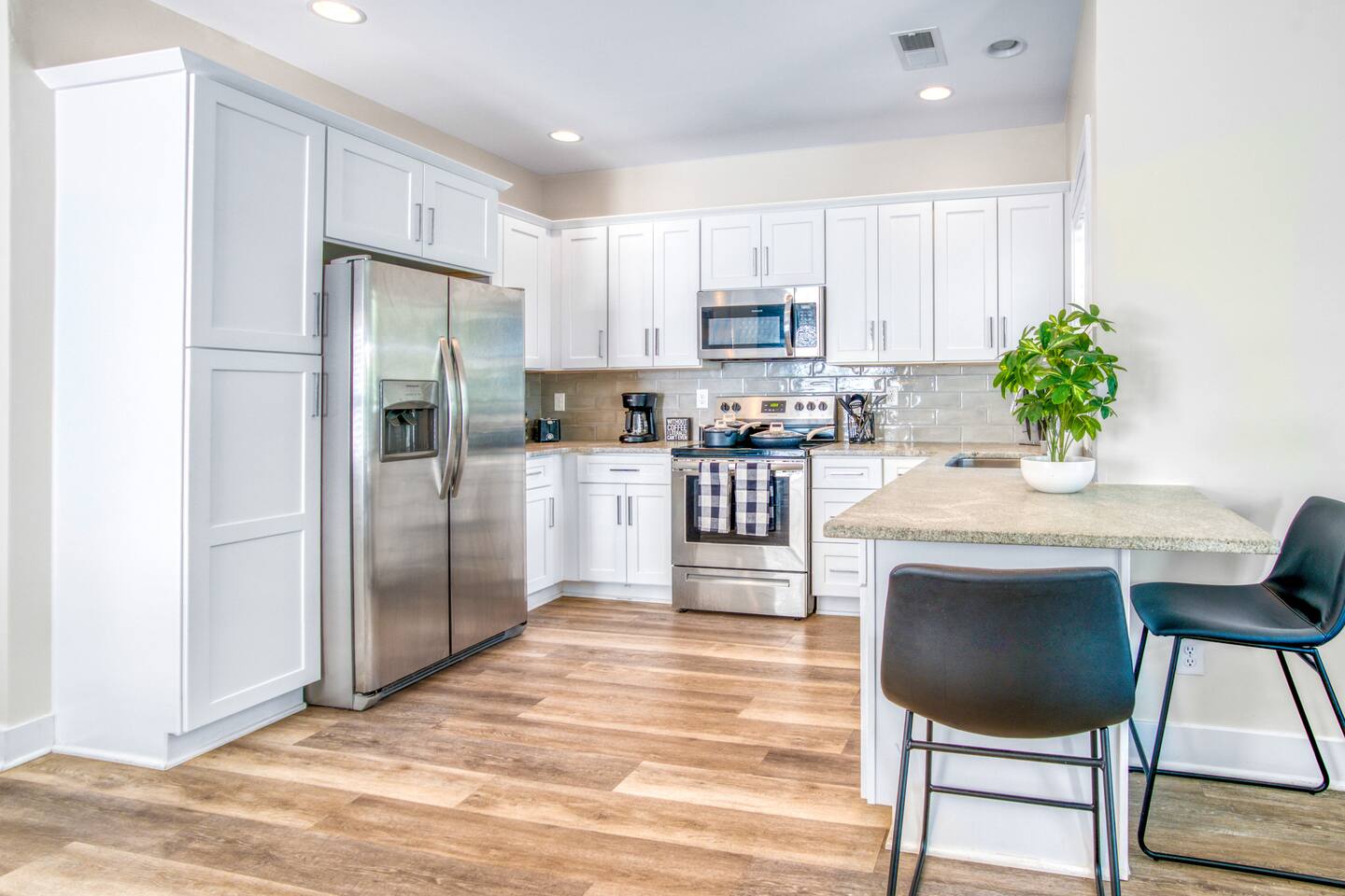 The modern, bright and airy kitchen is fully equipped with all new stainless steel appliances, a coffee station (including a drip coffee maker), pots & pans and baking essentials. Bright, open, and beautifully designed, this is a chef's kitchen made for entertaining!