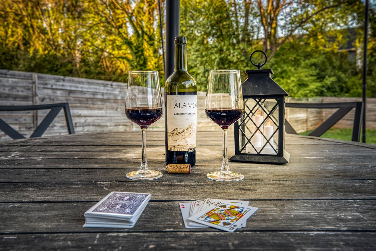 Stunning fully fenced in backyard with patio furniture for 6, grill, and yard games.
