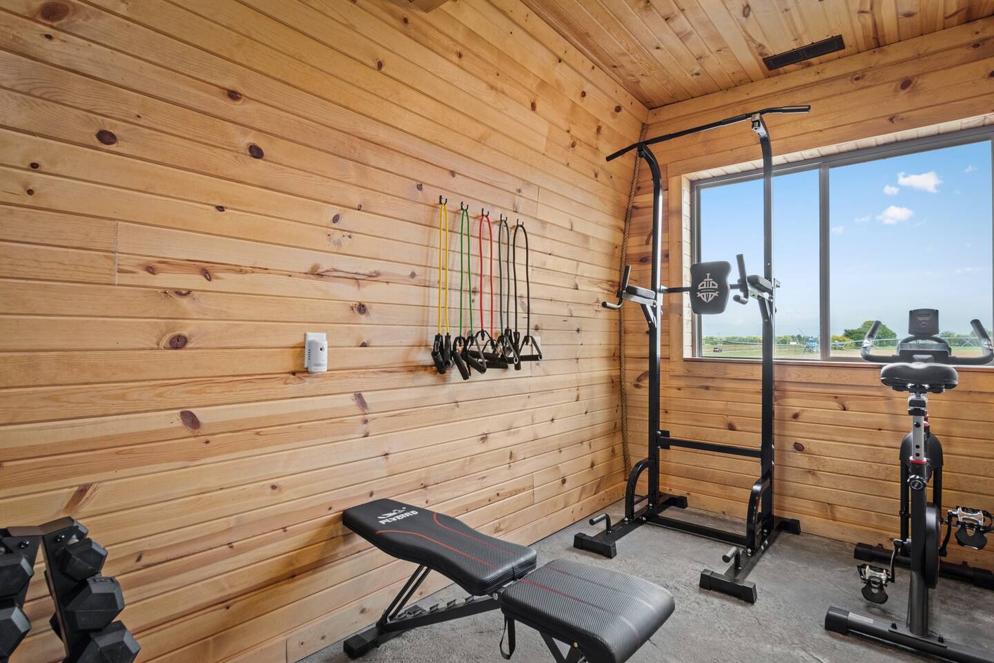 ★ The home gym / workout room is located on the 2nd floor of the barn and includes a stationary bike, chin up / dip station, dumbbell set up to 25 lbs, workout bench, and workout bands