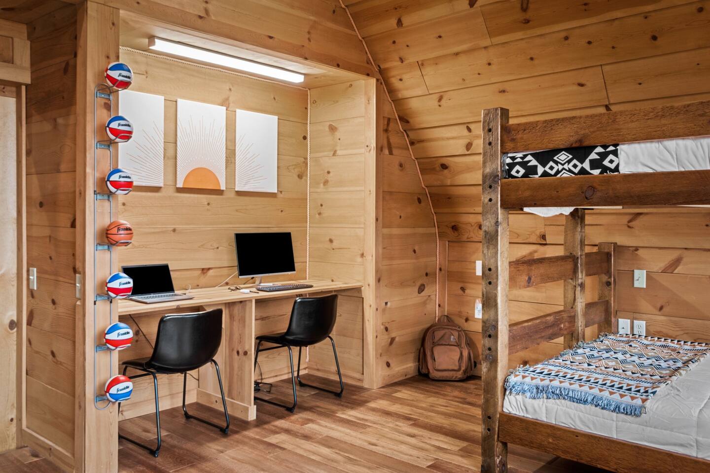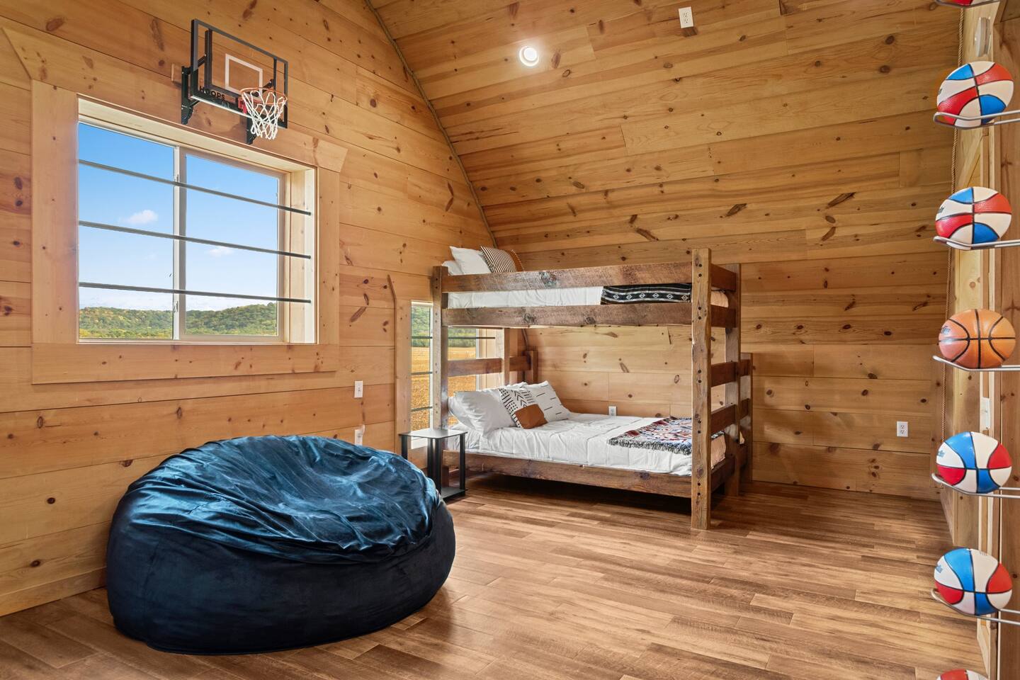 ★ There is a mid-size 8ft basketball hoop in the 3rd story bunk room with balls stored on the wall for guest use. The 'court' or shooting area is located in between the bunk beds