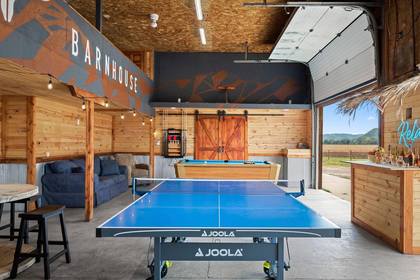 Had a great time. The kids loved all the games. The pool and hot tub were a big hit. The kitchen was more spacious than it appeared in the listing and well stocked with dishes, utensils, etc. There was plenty of room to hang out in the living room and in the extra area outside the bunk room. We used the fire pit several nights and it was great to have the grassy areas around the barn. The view from the deck was beautiful, especially in the morning. I did have an issue with the bedroom count. I went in fully expecting 5 bedrooms and a bunk room. One of the bedrooms was a loft (which I was aware of) but it looked down into the bedroom below and was accessible by a ladder made of 2 x 4's that went straight up through an access hatch. This was not obvious in the listing. Hard to climb and we could not use it. To get to the movie room or weight room you had to walk through another bedroom, so very little privacy in that room. A floor plan on the listing might have been helpful.