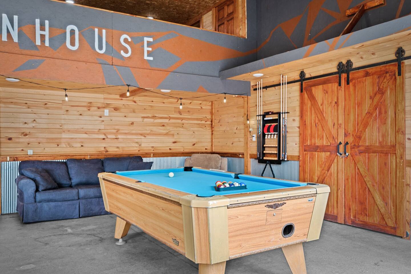 ★ The 'party shed' is a 2500 sqft large shed structure across from the barnhouse, which includes a mini tiki bar, pool table, ping pong table, darts, plunge pool/sauna/shower, and the entire commercial indoor park. Half bathroom and kitchenette area is located on the first floor
