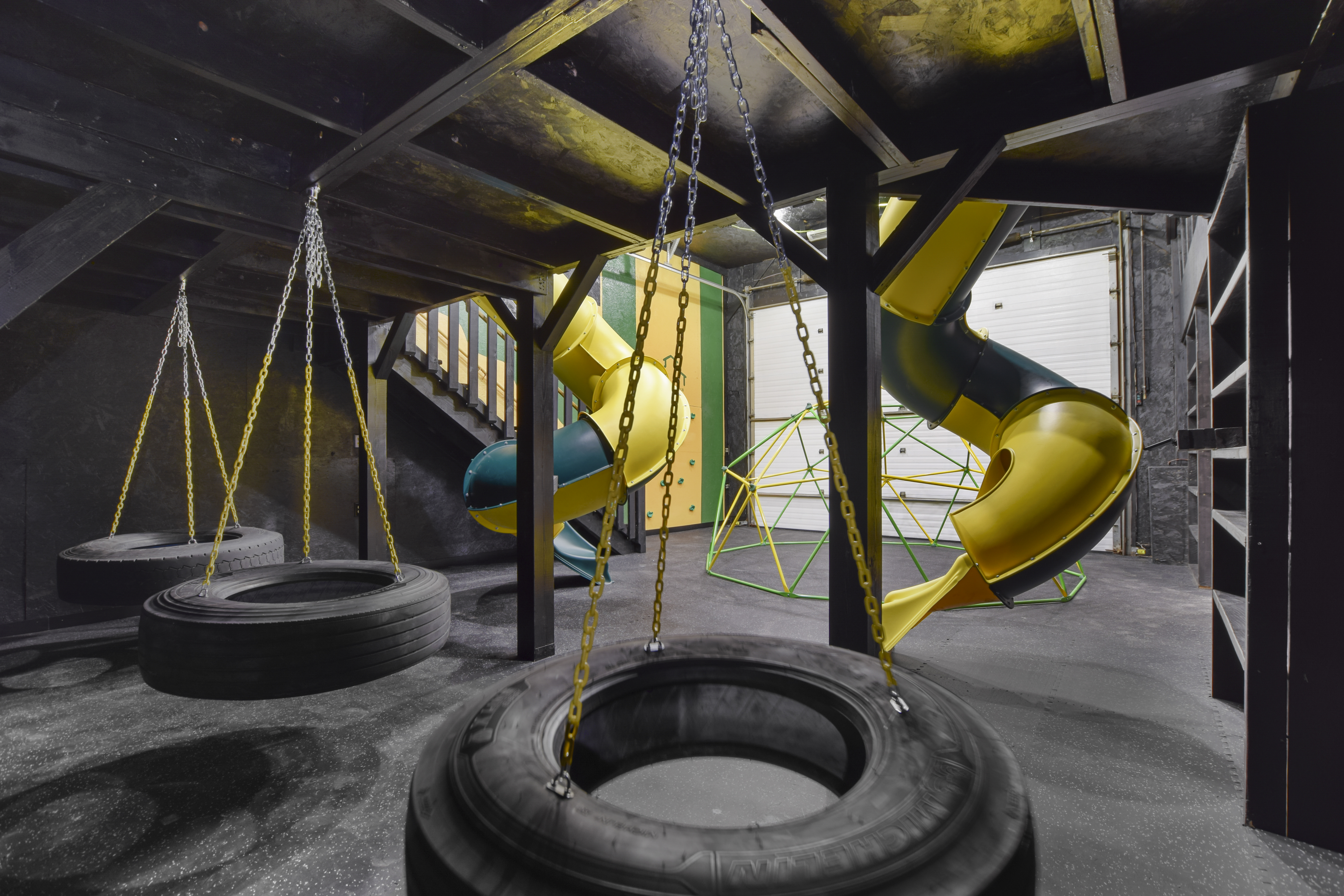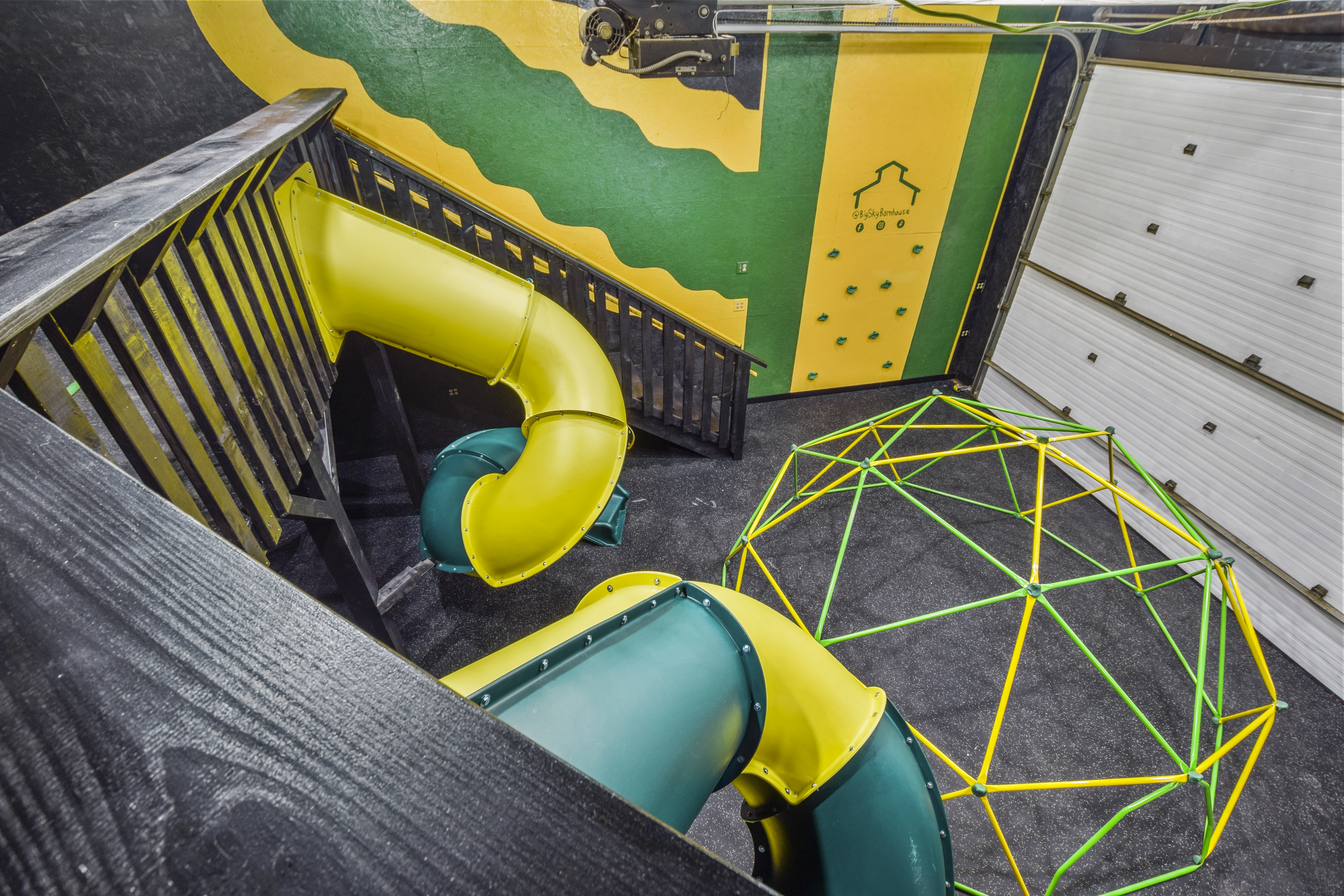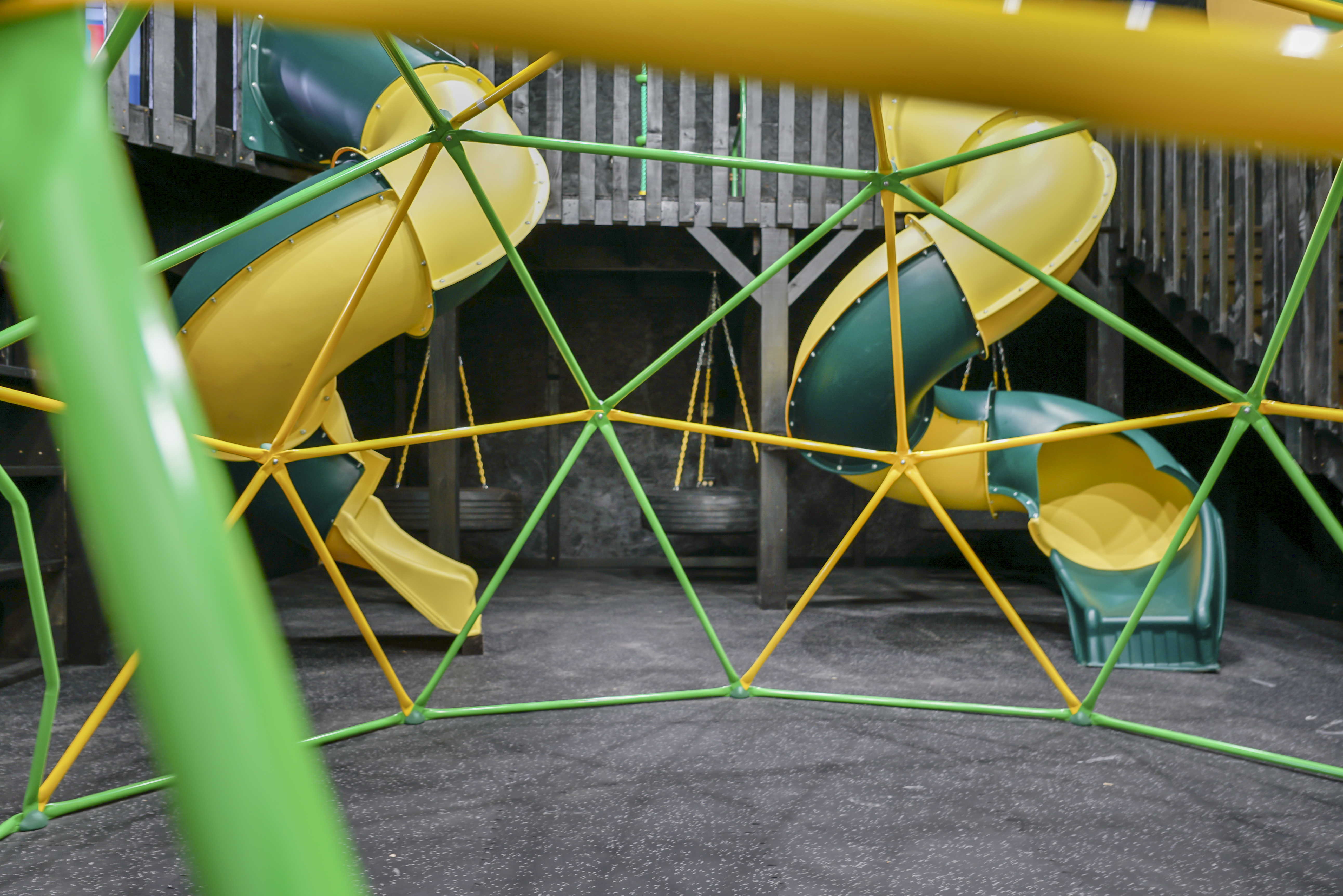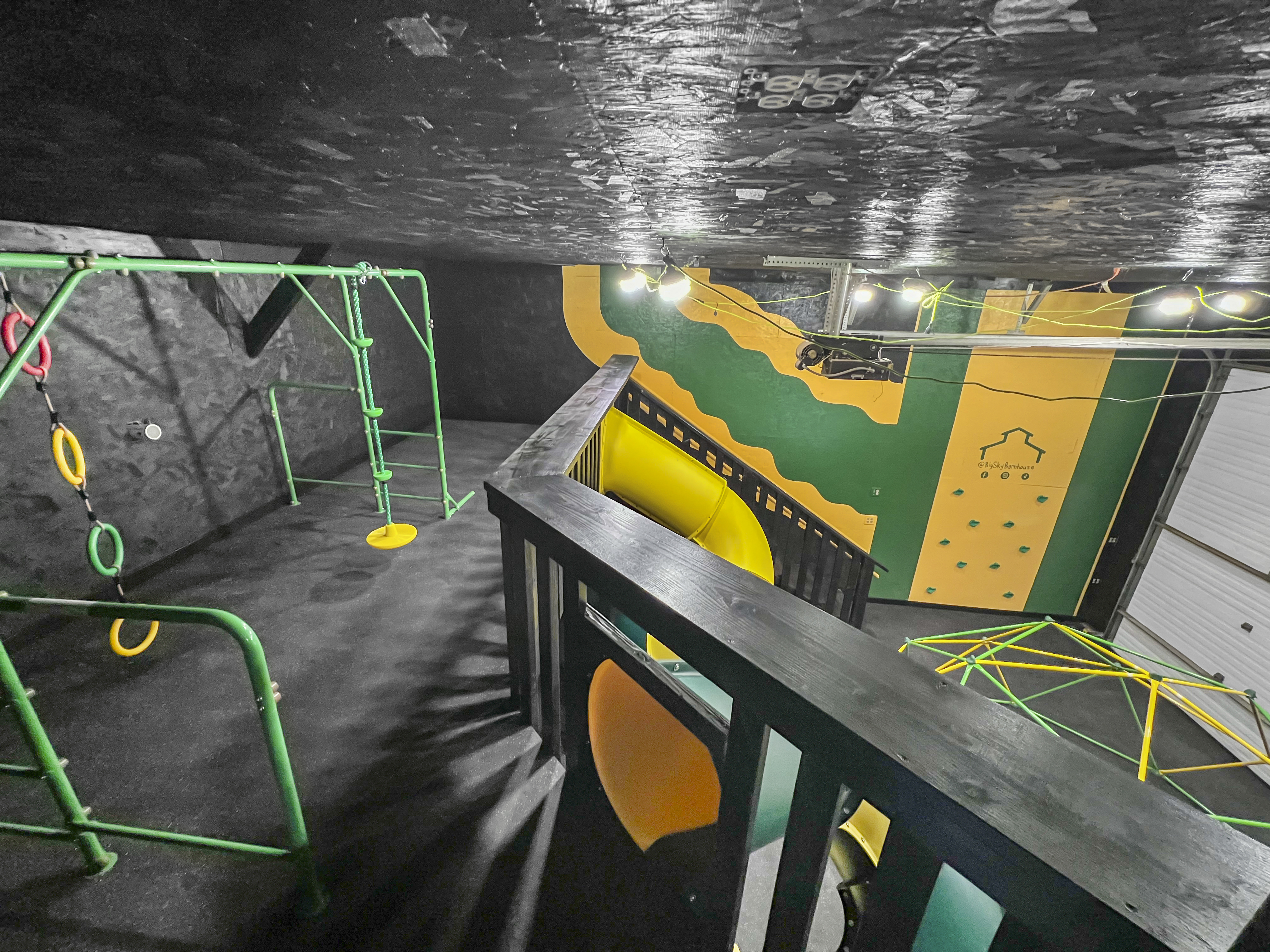 ★ The indoor commercial double-level park/playground (in the party shed) is heated and cooled, and has 2 tube slides, a hexagon climbing dome, 3 tire swings, a rock climb wall, and monkey bars, all on rubber flooring and flows directly into the indoor pool room on the second level and the party shed amenities on the first level.