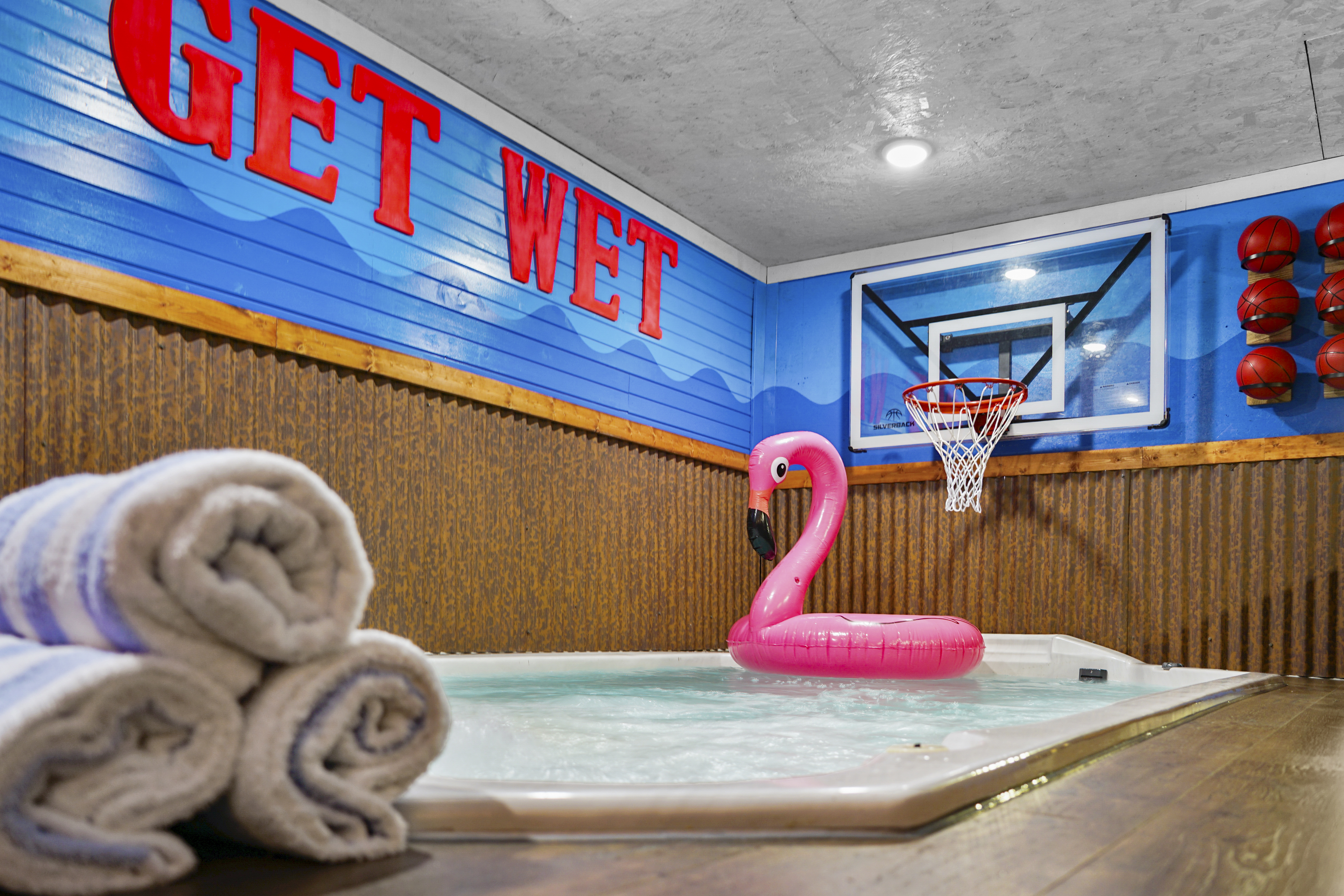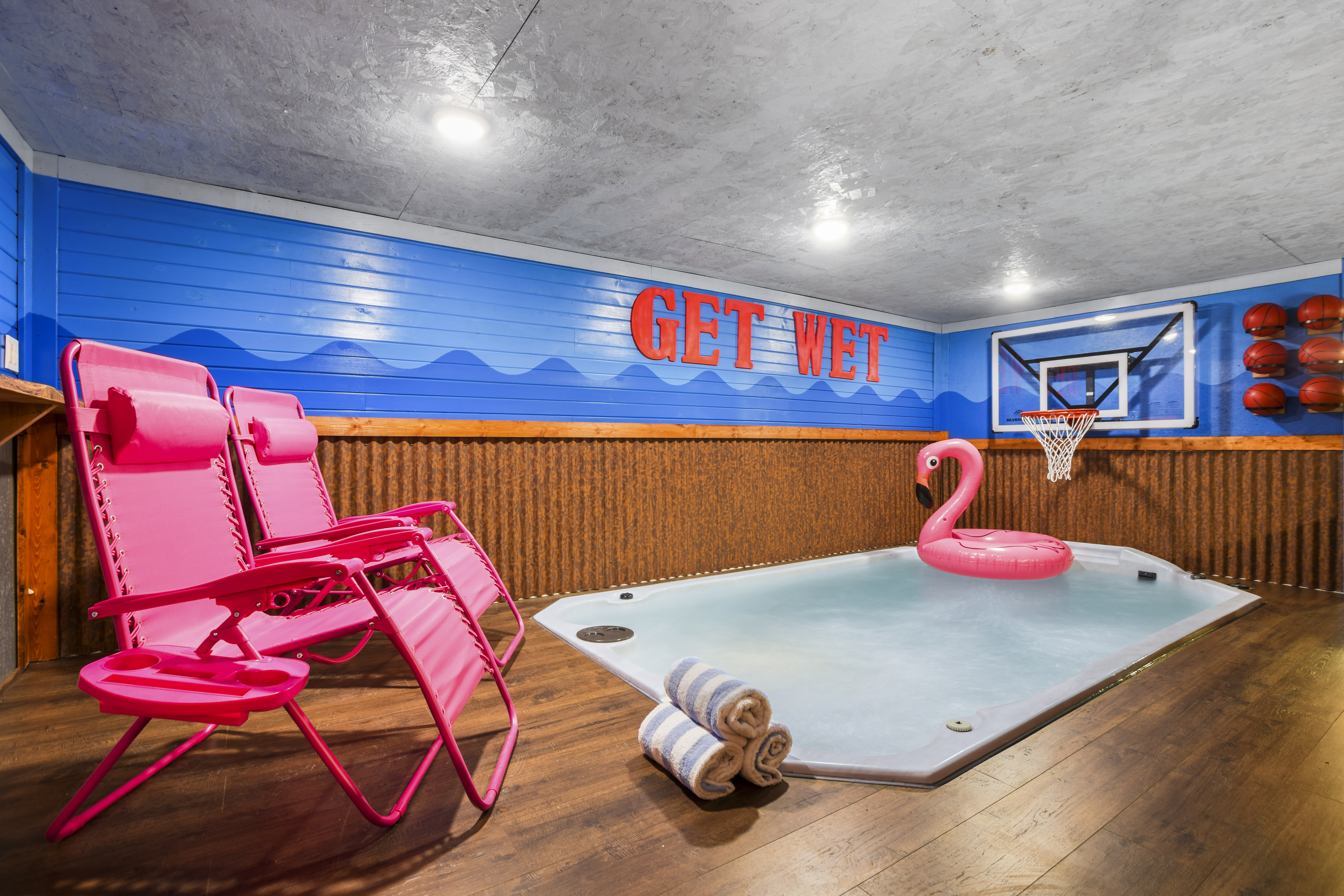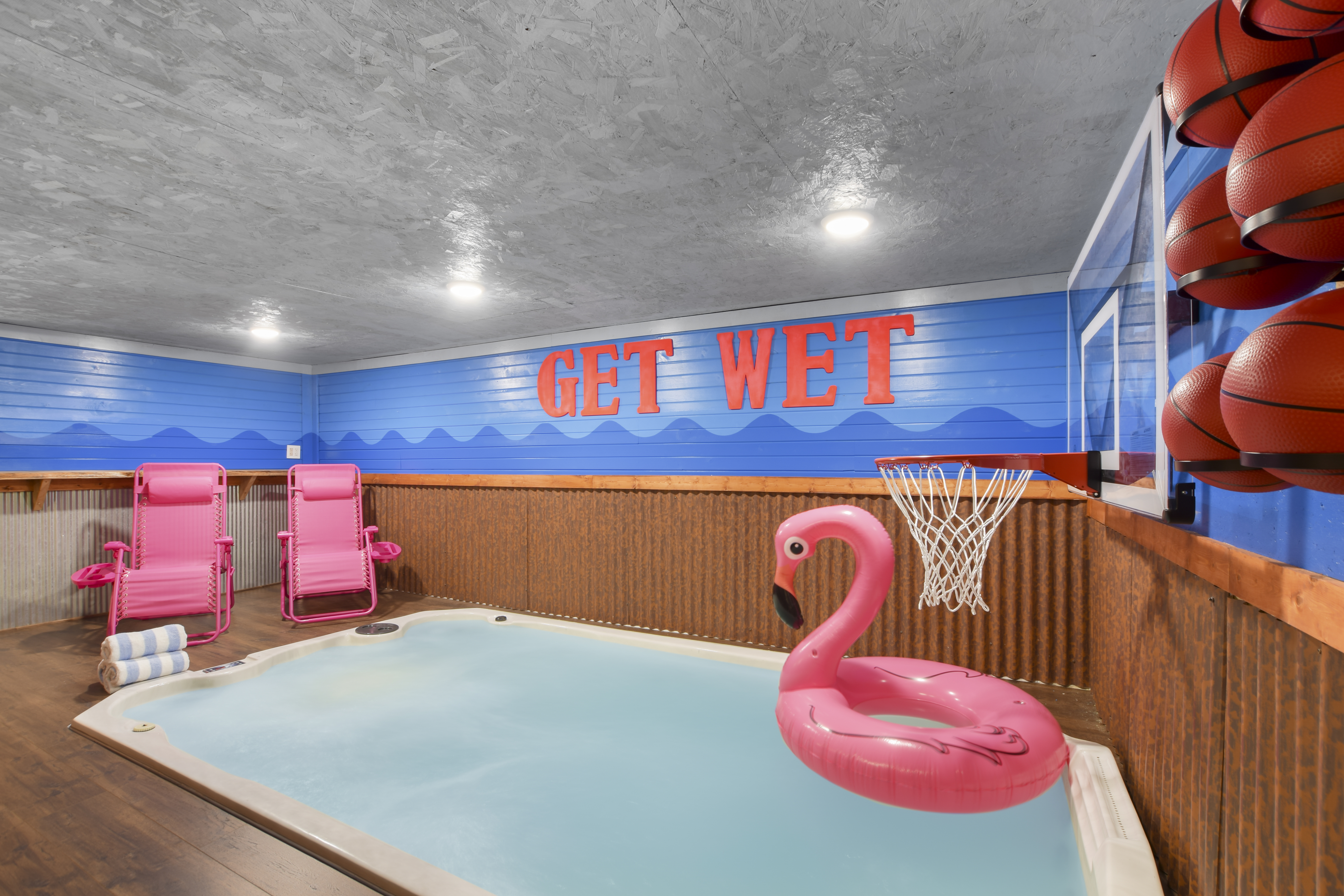 ★ The INDOOR in-ground heated plunge pool is available for guest use YEAR-ROUND and also doubles as a swim spa and/or triple sized hot tub. Includes a regulation basketball hoop with pool basketballs, lounge chairs, a flamingo floatie, all next to the sauna room and shower area.
