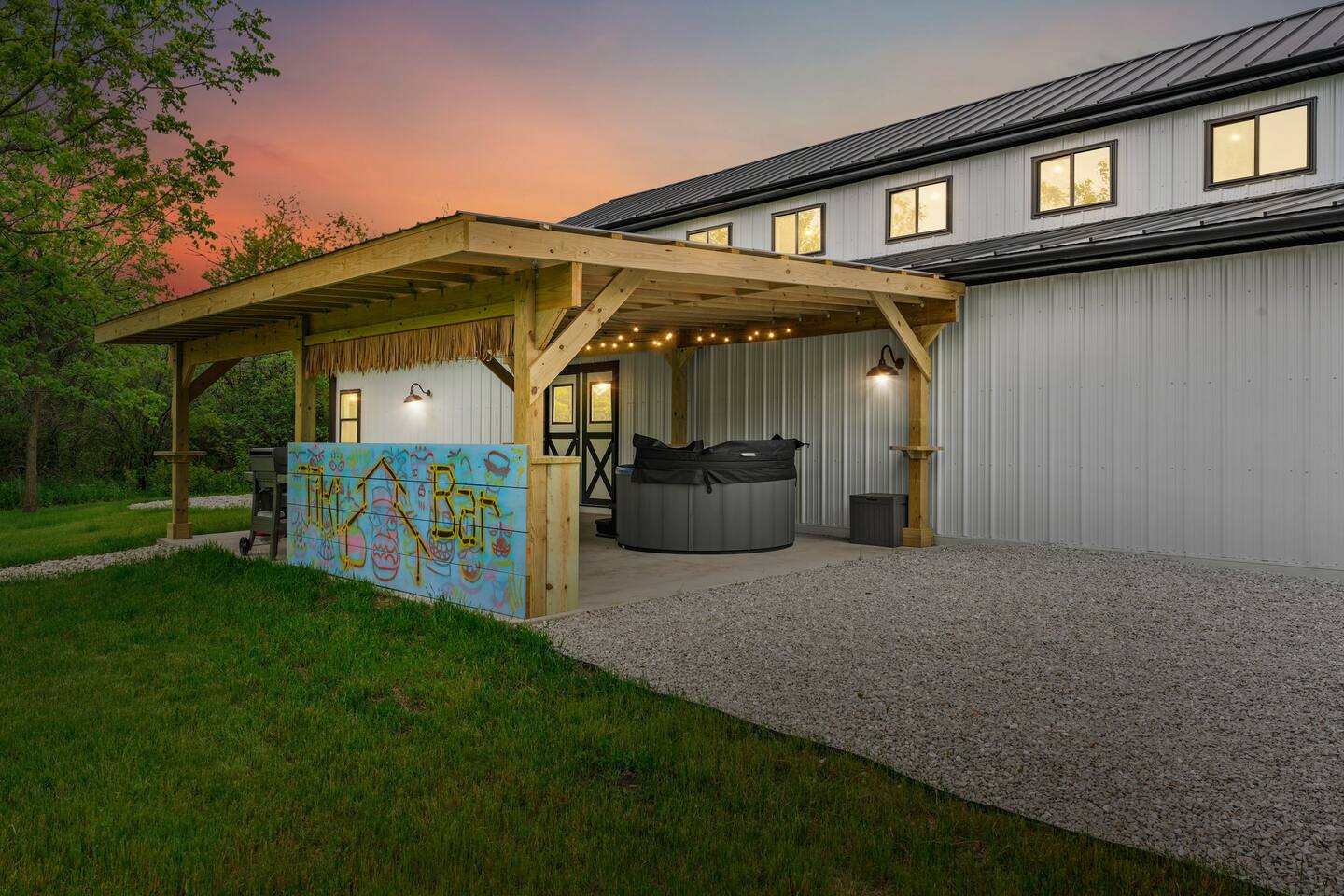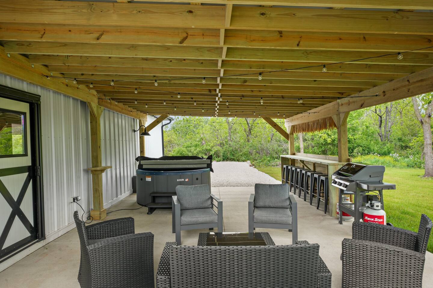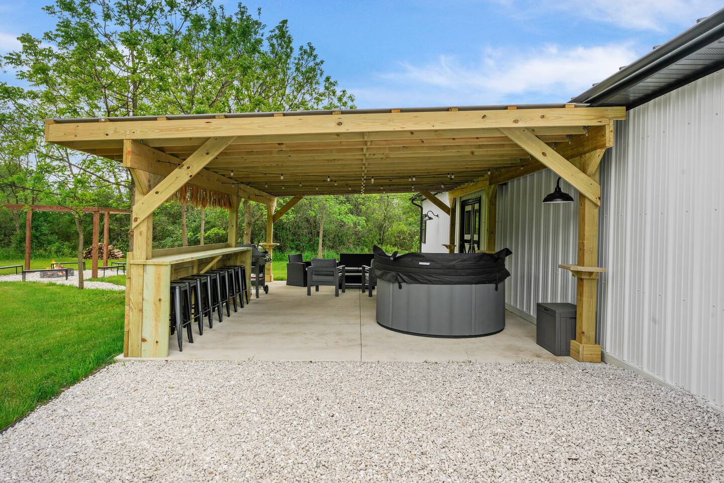 ★ The hot tub, fire pit, patio, covered pergola, grill, lounge, and outdoor dining space is located on the rear side of the barn before the backyard.