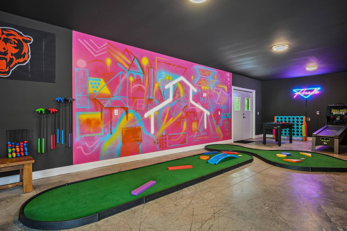 ★ The mini golf course has 2 holes and is located on the first floor of the barn in the garage area, next to the lounge, pool table and arcade. The arcade includes shuffleboard, skee-ball, pinball, pac man, and darts.