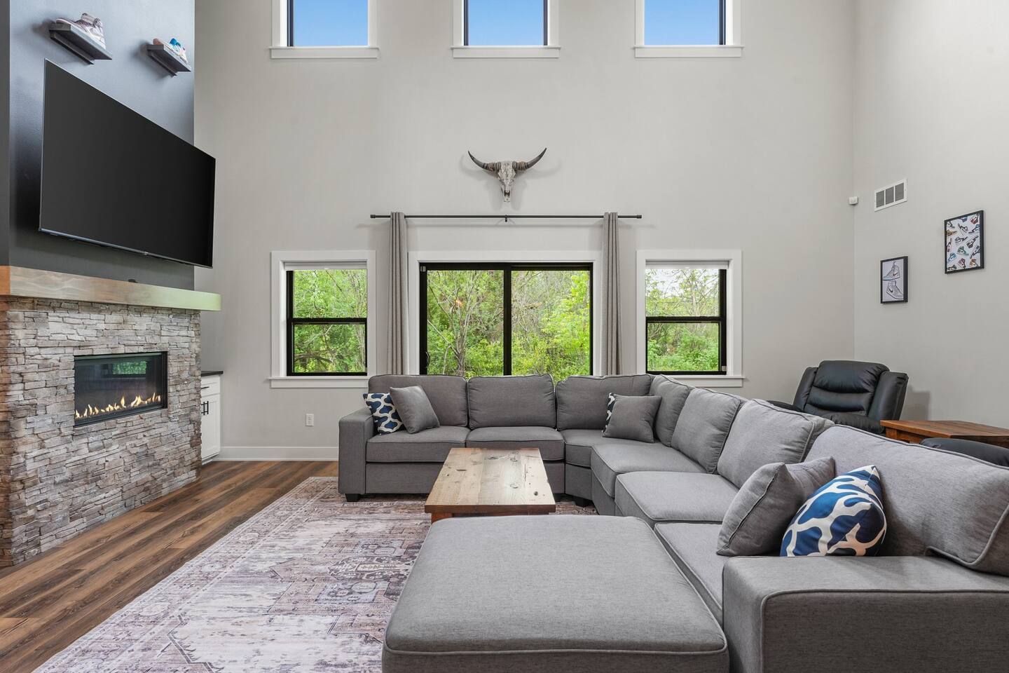 Big Sky Barnhouse...Where historic meets extraordinary. Sleeps up to 20 guests w/ 6 BR's, 11 beds, 3 full baths, 5000 sq ft. INdoor B-Ball court next to a custom barnwood 24ft sports bar + mini golf. Pool table + lounge with an arcade including shuffleboard, pinball, skee-ball, pac-man, darts, and giant connect four. Private movie theater inside! Exquisite indoor barnwood pergola dining area. Tiki Bar, Hot Tub, Weber Grill + outdoor lounge. Walking trail on back secluded acreage on the property!