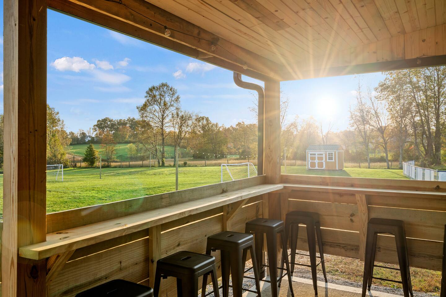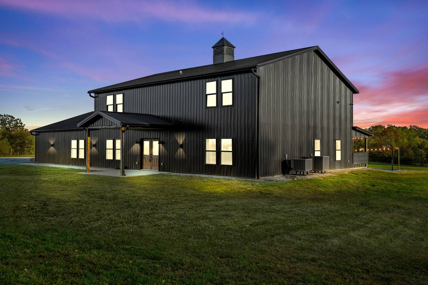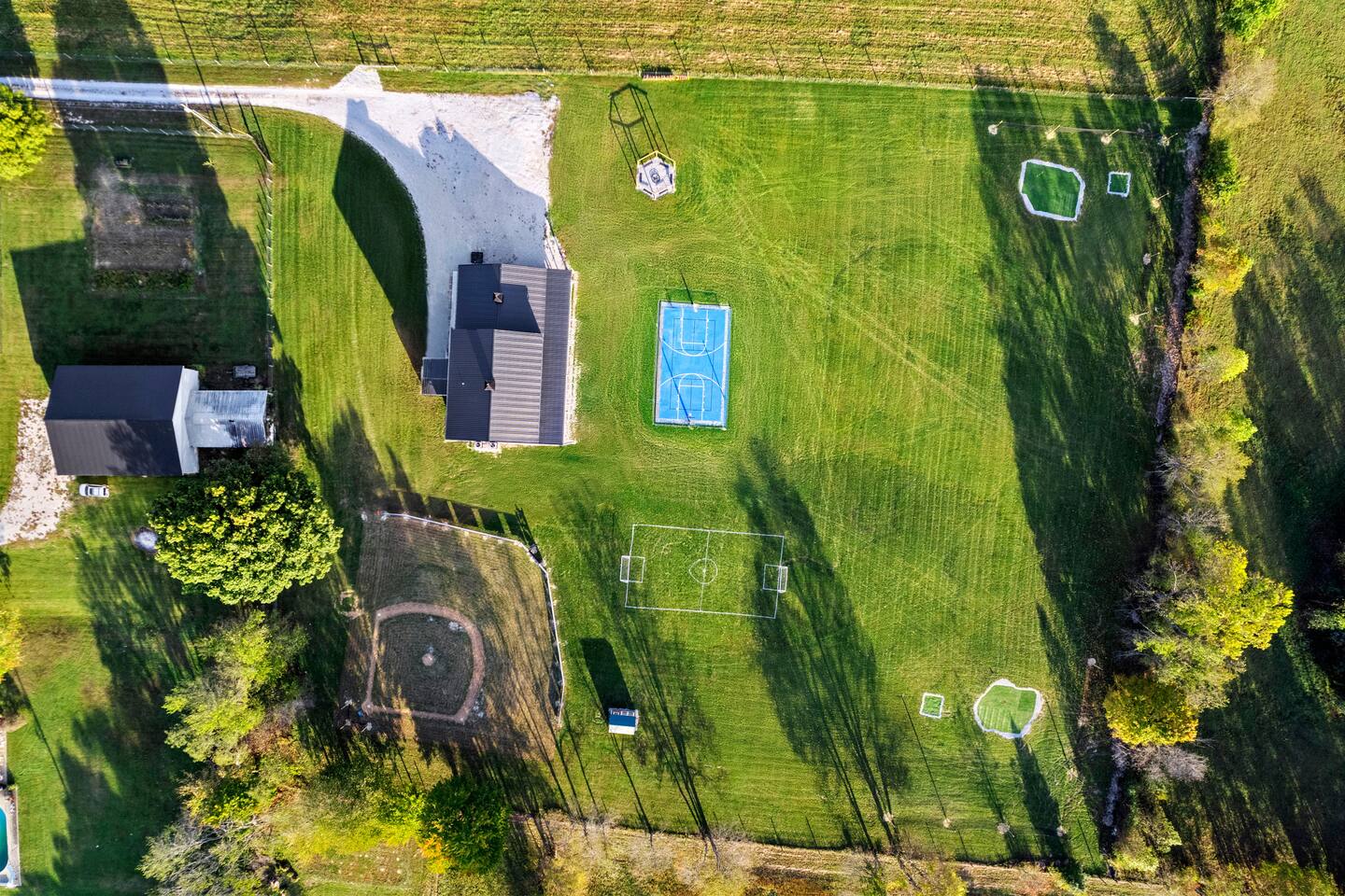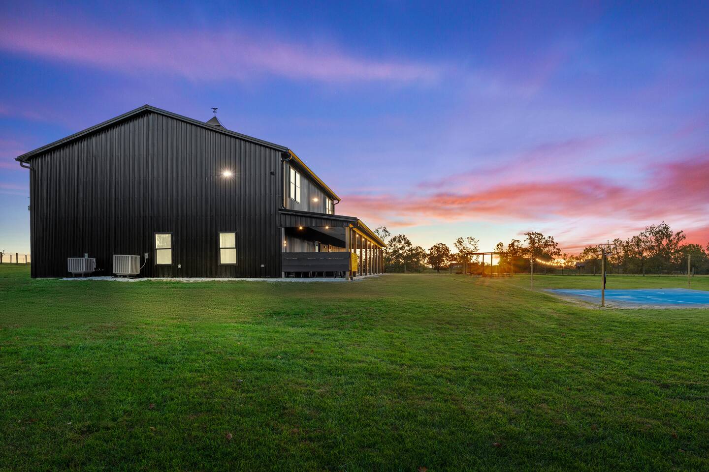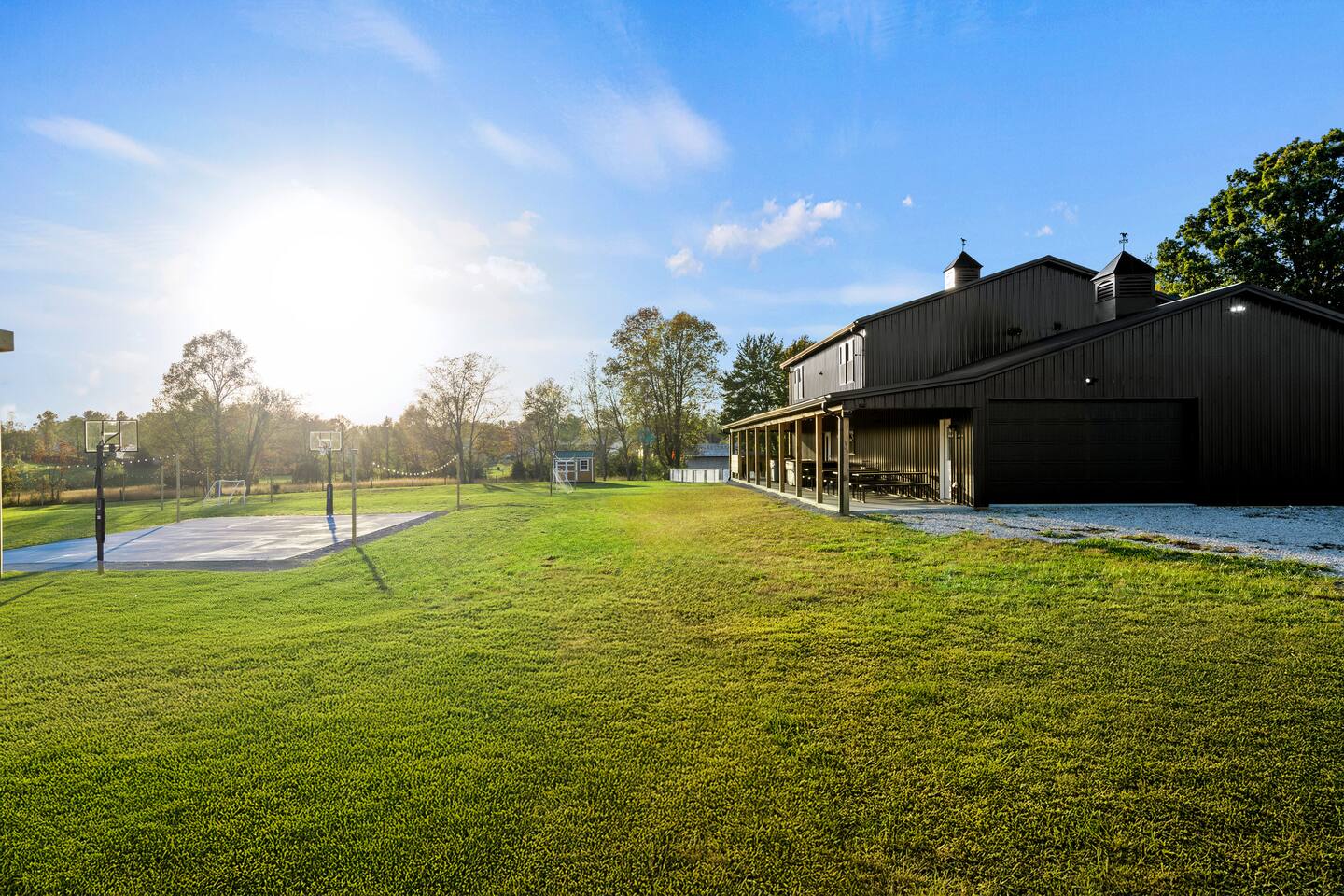 Big Sky Barnhouse...Where historic meets extraordinary. Sleeps 30 guests w/ 7 bedrooms, 19 beds, 4 baths, 5000 sq ft + a private 5-acre sports complex in the fenced-in backyard! Includes a 2-hole golf course (Two 90-yard par 3's), basketball court, regulation wiffleball field w/ a home run fence + scoreboard, 3v3 soccer field, flag football belts + a pickleball court! 2 hot tubs, pergola fire pit, custom speakeasy bourbon bar, 30 person movie theater, arcade, skee-ball, pool table, darts + more!