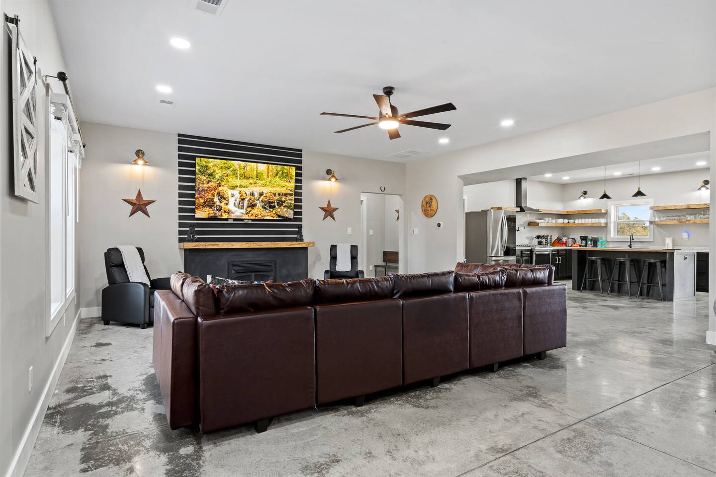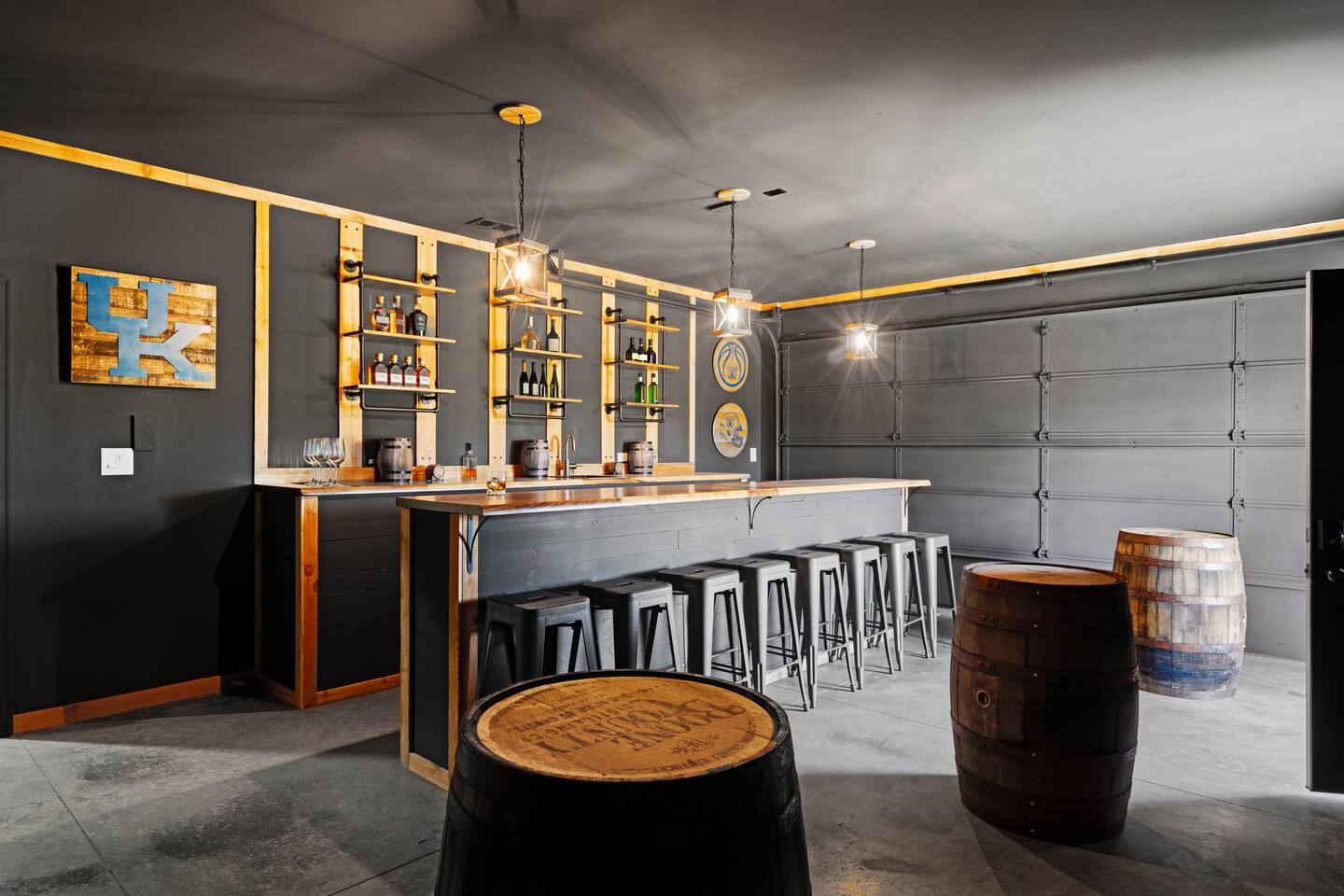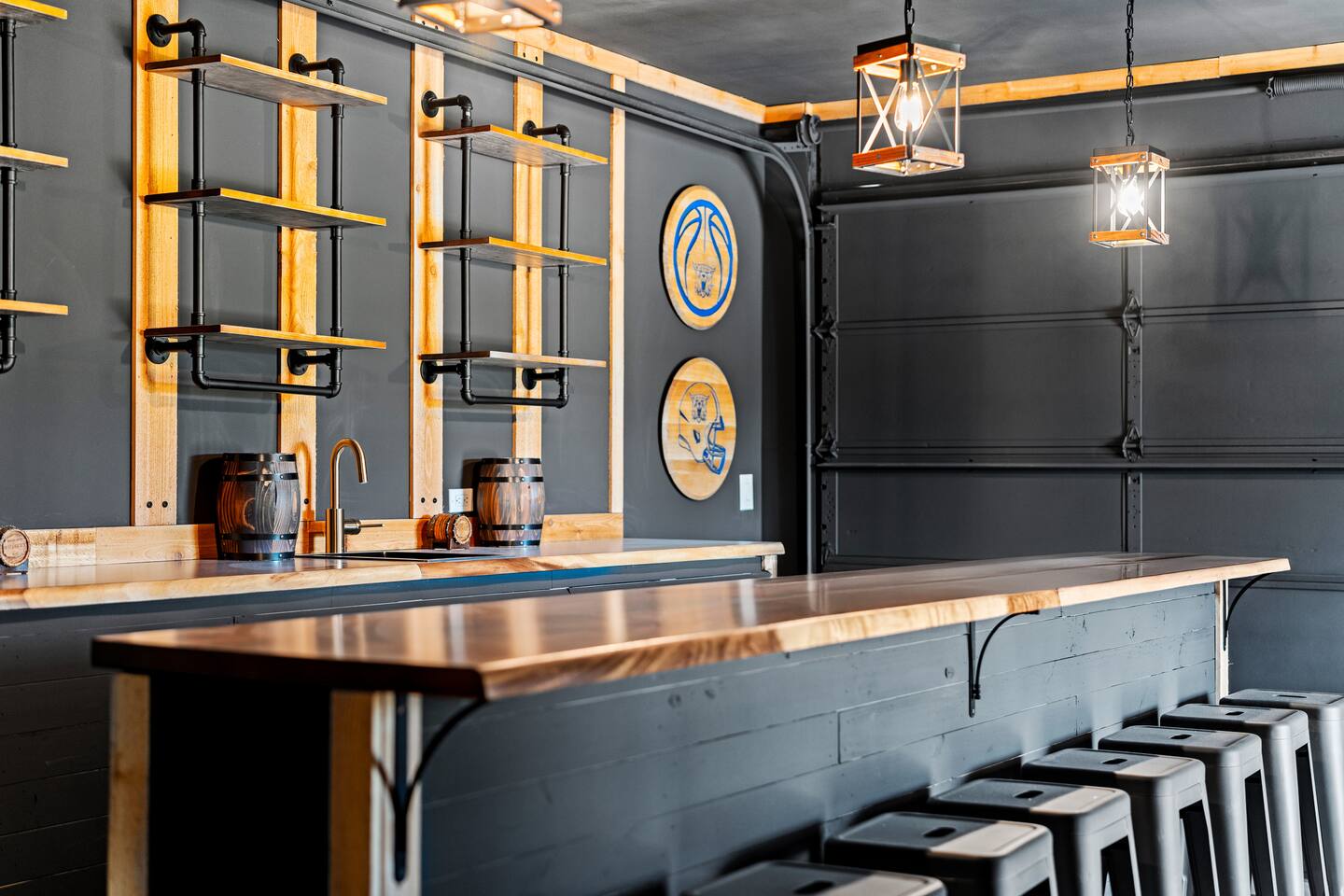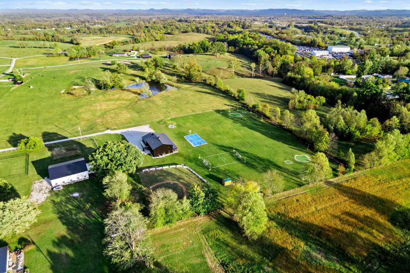 Big Sky Barnhouse...Where historic meets extraordinary. Sleeps 30 guests w/ 7 bedrooms, 19 beds, 4 baths, 5000 sq ft + a private 5-acre sports complex in the fenced-in backyard! Includes a 2-hole golf course (Two 90-yard par 3's), basketball court, regulation wiffleball field w/ a home run fence + scoreboard, 3v3 soccer field, flag football belts + a pickleball court! 2 hot tubs, pergola fire pit, custom speakeasy bourbon bar, 30 person movie theater, arcade, skee-ball, pool table, darts + more!