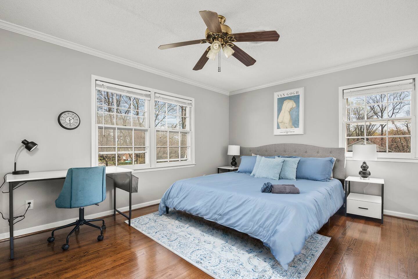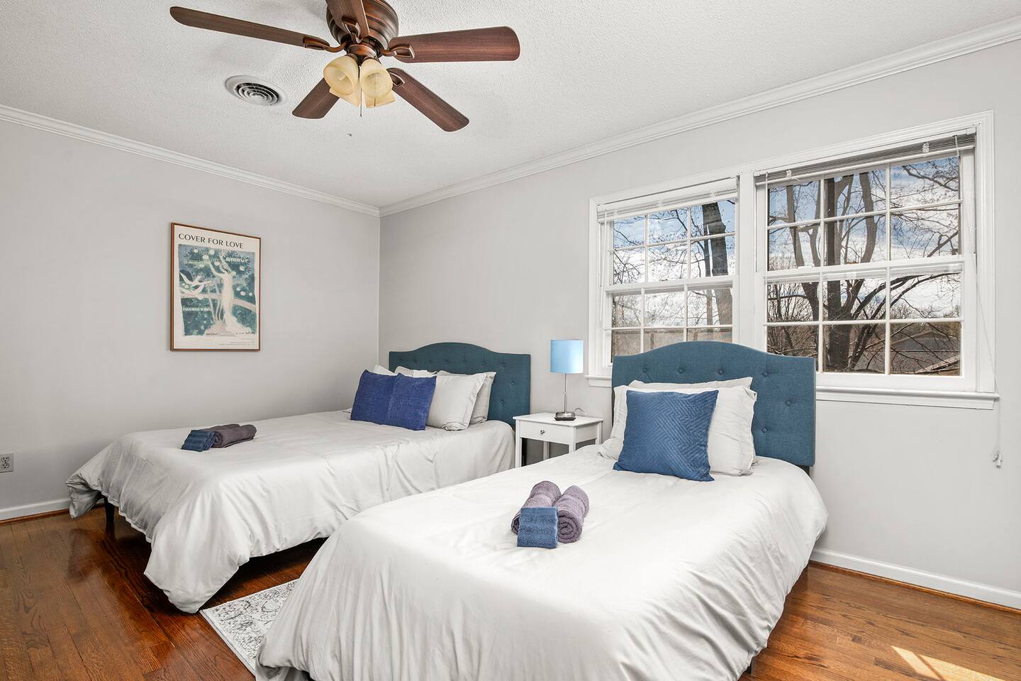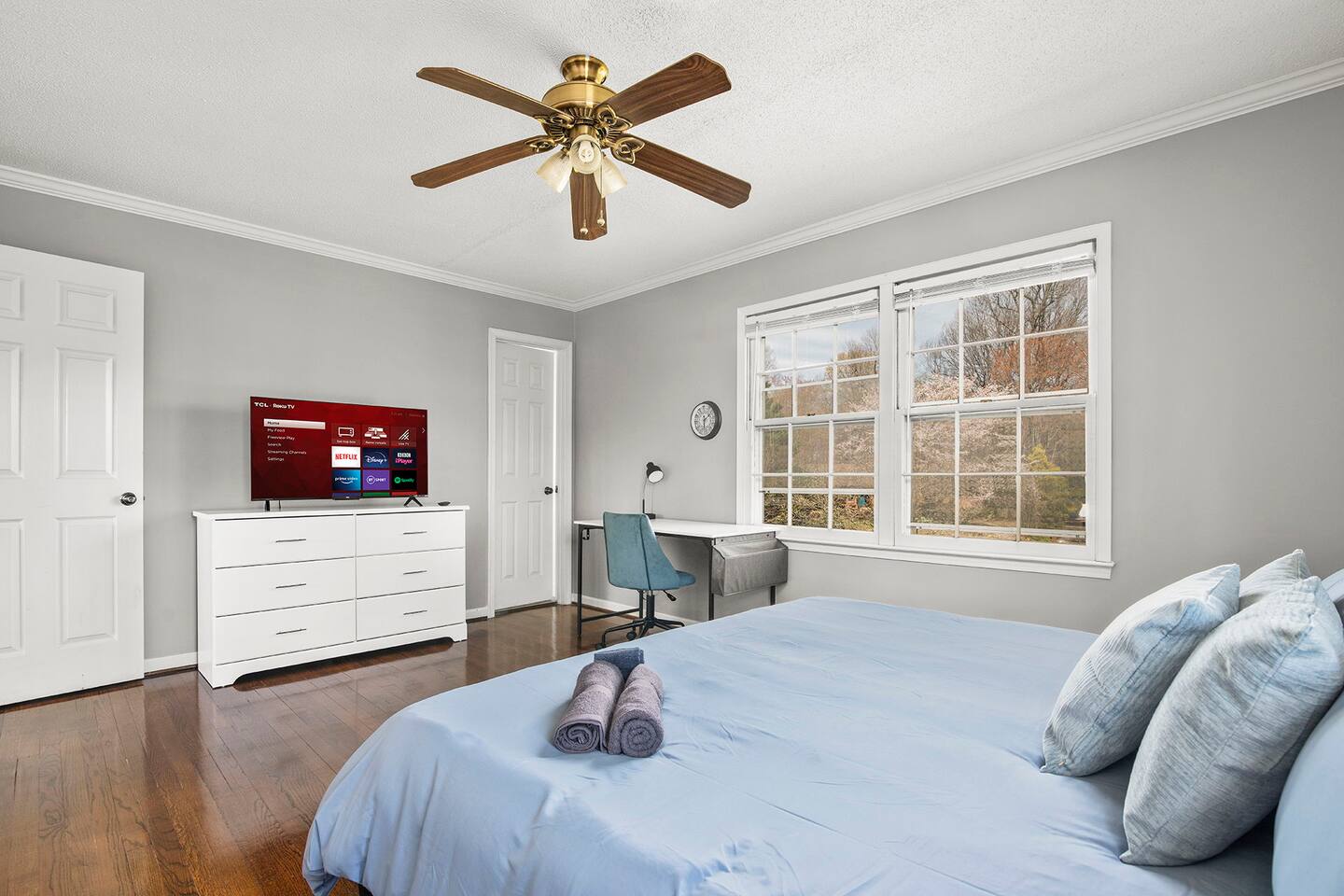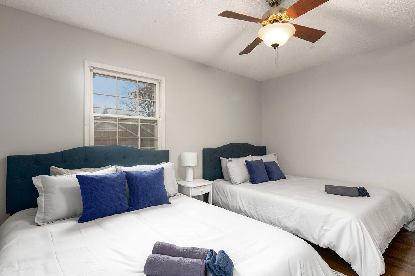 Four spacious bedrooms two of which are equipped with 43-inch Roku Smart TVs. The master bedroom has a king-sized bed, bedroom 2 has a queen-sized bed, bedroom 3 has two queen sized beds and bedroom 4 has a queen and twin-sized bed.