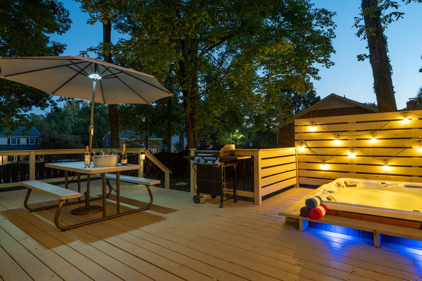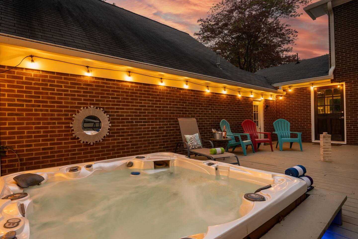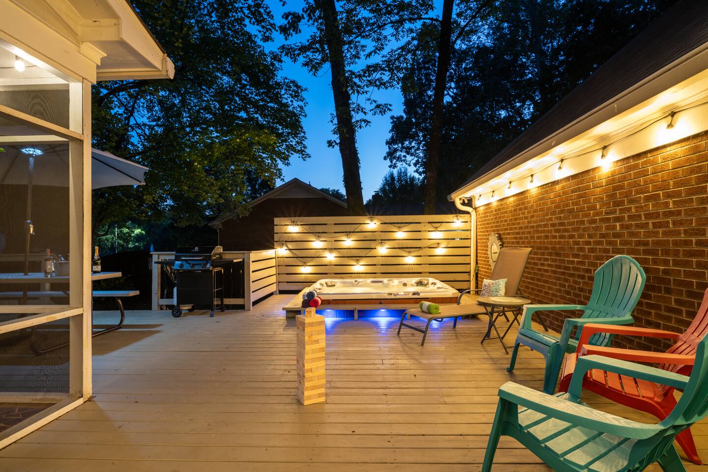 A spacious outdoor area with a fully fenced backyard, hot tub, huge deck, games, and grill, perfect for a barbecue party with your group. It also has a fire pit and Adirondack chairs that provides a warm and inviting space for cozy evening chats, making it a great place to spend time with your friends and family.