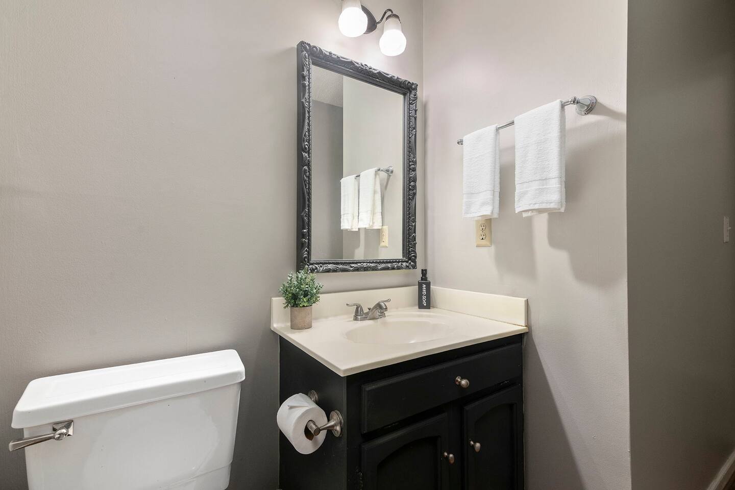 Two full bathrooms and one half bathroom come with showers and are equipped with cabinet space and complimentary bath products.
