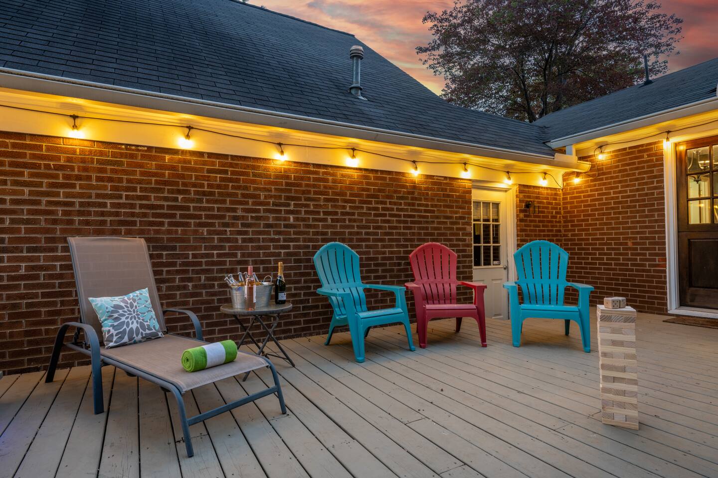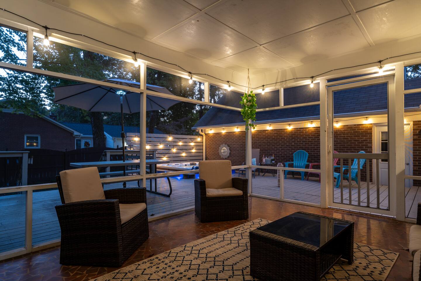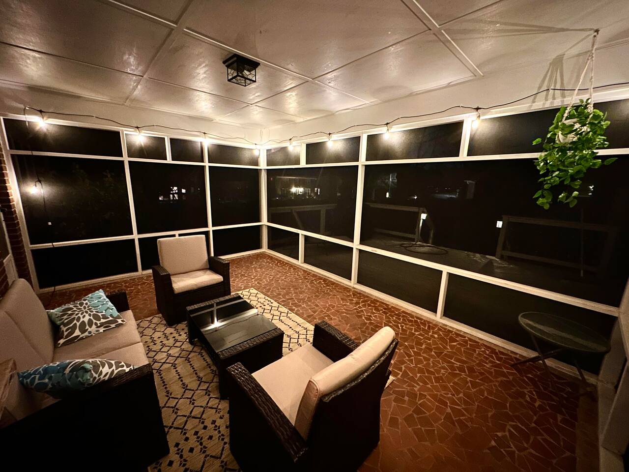 Surrounded by overhead string lights and patio furniture making for the ideal space to sip on your morning coffee or wind down in the evening in a relaxing atmosphere.