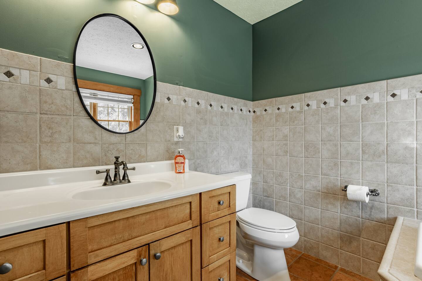 The half bathroom is located across the hall on the main floor, while the en suite bathroom with double vanity, shower, and jacuzzi, and another double vanity bathroom with tub are located on the second floor.